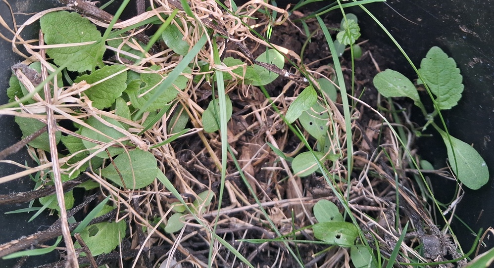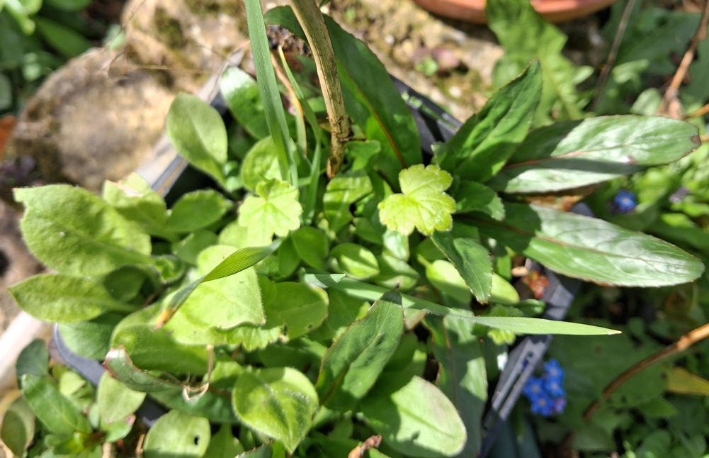 I had so many Iris foetidssima in my last garden and so many self-seeding I was surprsed I didn't have any seedlings appearing in the pots in my new garden. I finally had 1 but it appeared to die. Then I noticed this largish one in this pot with a large green alkanet. I wonder if it is foetidissima but definitely looks like an Iris. Will see what happens. When the ground is softer I am going to try to plant this pot in the ground.