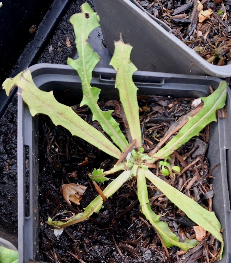 these two are clearly beaked hawk's-beard (Crepis vesicaria), now I just need to get them in the ground; the ground's been rock hard for a long time but I'm hoping recent rain has finally made it possible to plant out