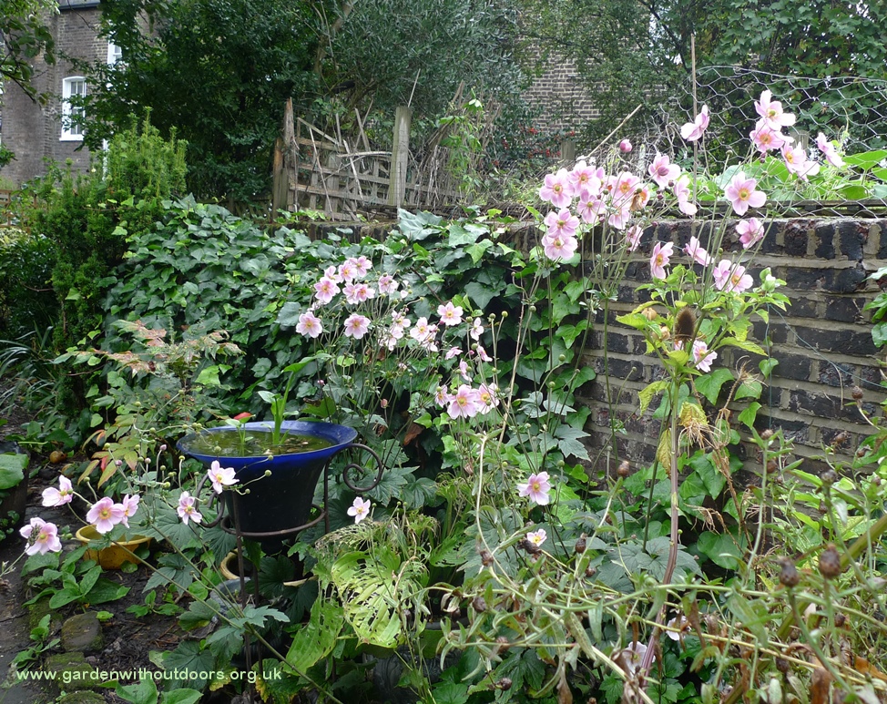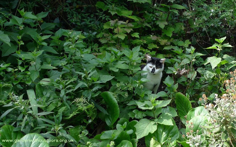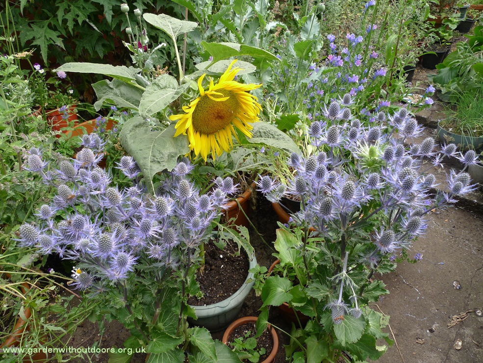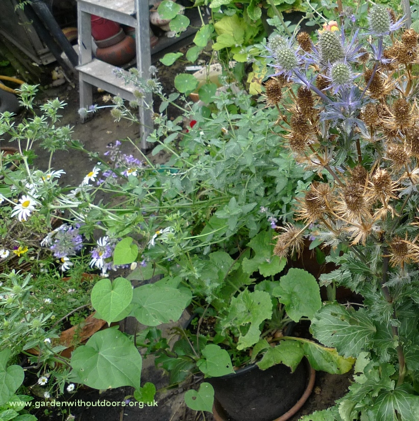 hollyhocks used to be the star of the garden next door but the hollyhock weevil seriously reduced numbers, I am trying to grow some replacements from seed but the slugs are seriously damaging the seedlings, I am going to try keeping them in pots until they are larger and maybe able to survive? mugwort to the left