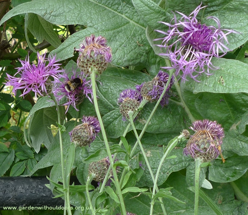 My greater knapweed seem to be struggling a bit, I guess the environment isn't great, a shallow flowerbed that isn't watered enough (I can't water the garden except for pots) but at least a bee is there.