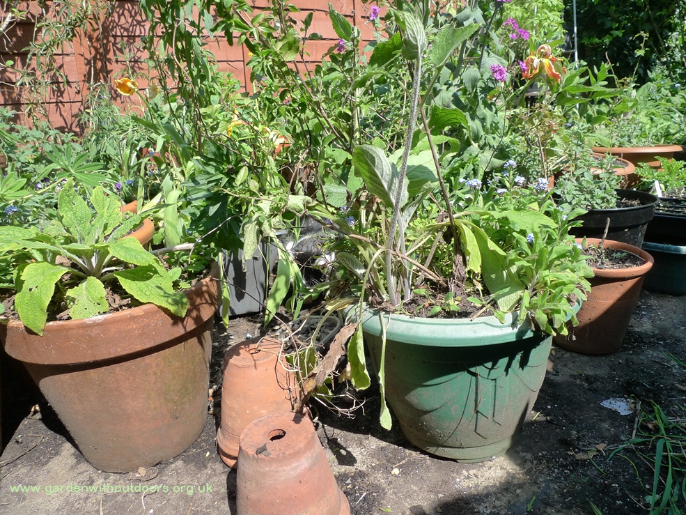 more foxgloves in the front, they seem to grow to fit their situation, these didn't have much room in this pot so they're smaller