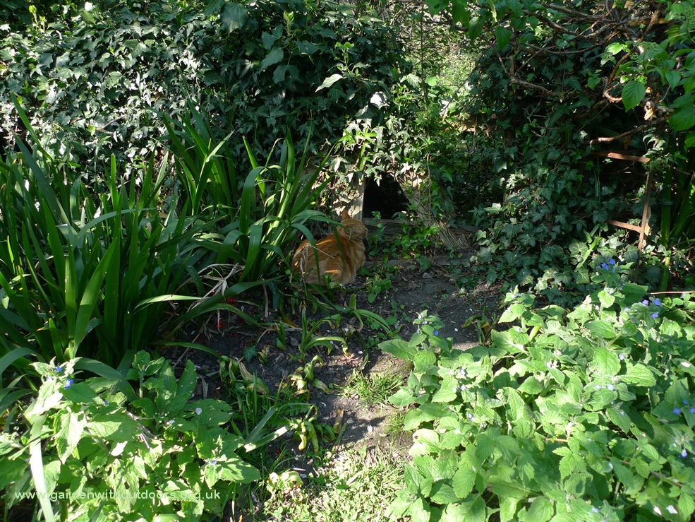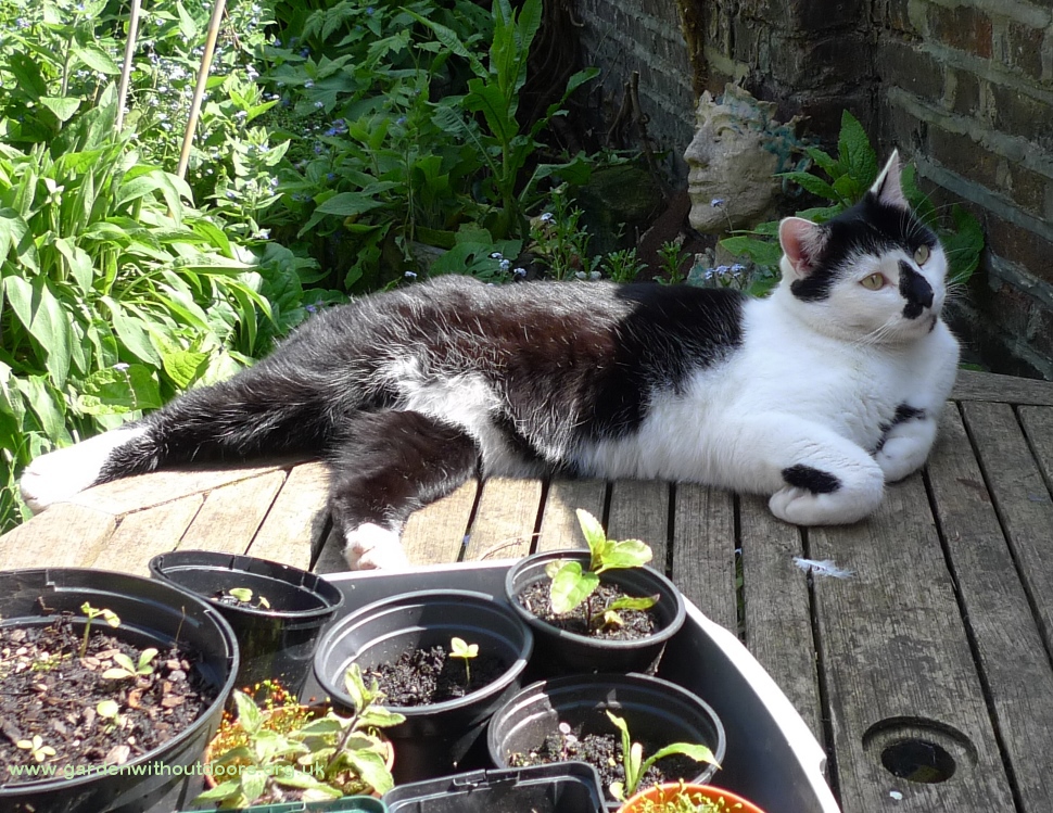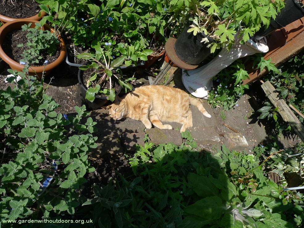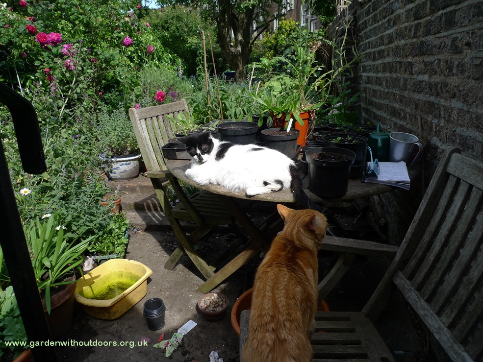 two of my cats, with my messy patio - I have lots of containers of water - for plants and animals, the cats like to drink from them, no doubt the foxes as well