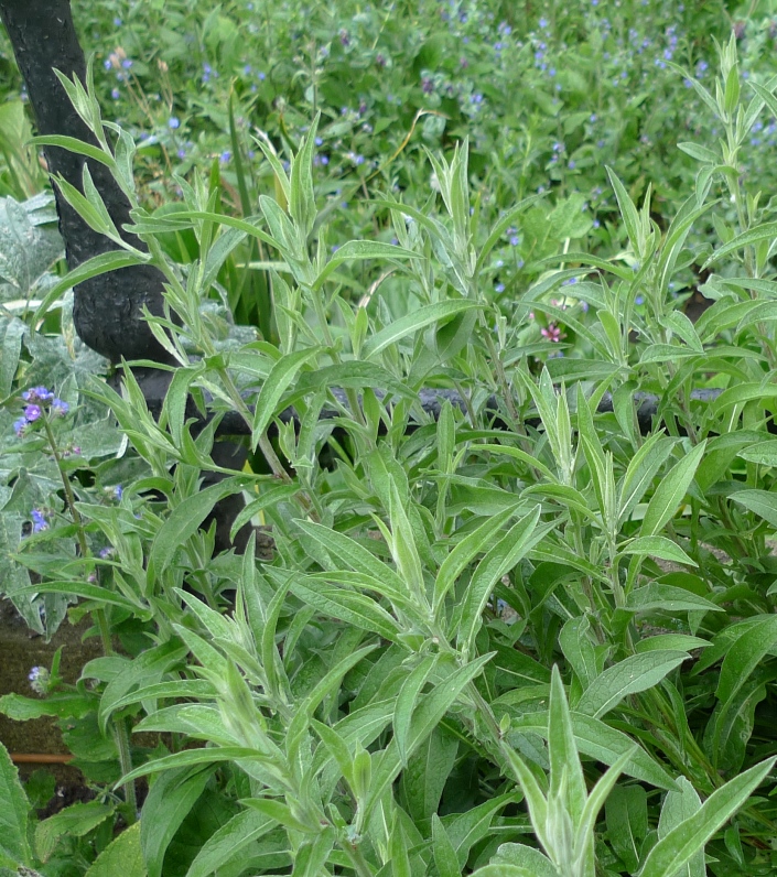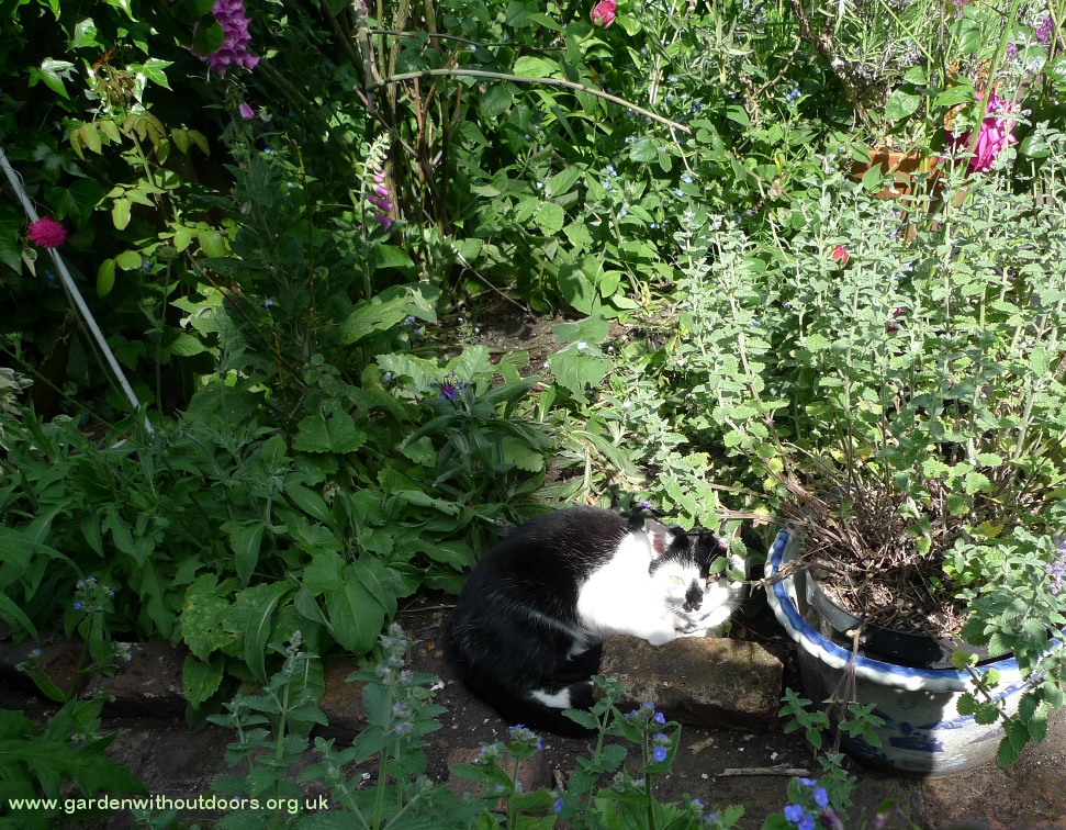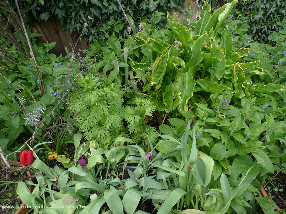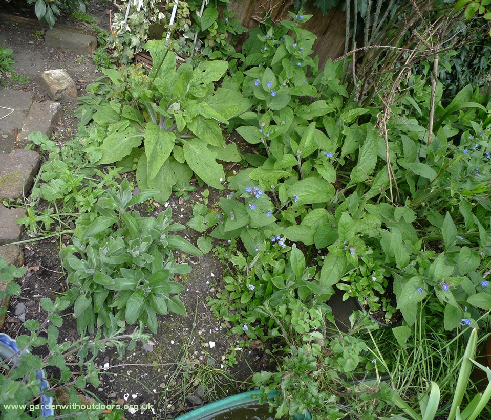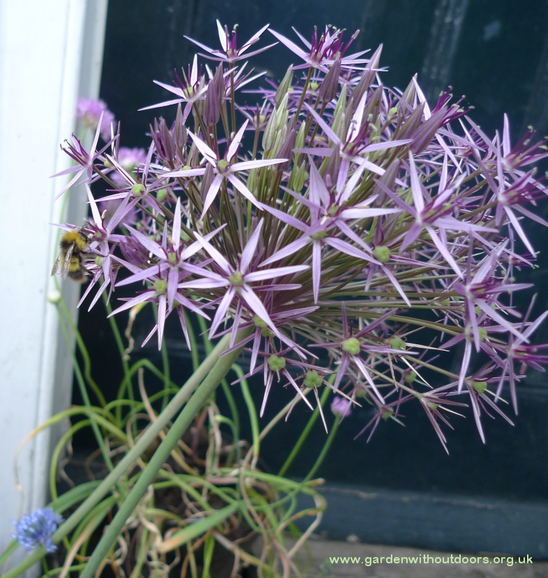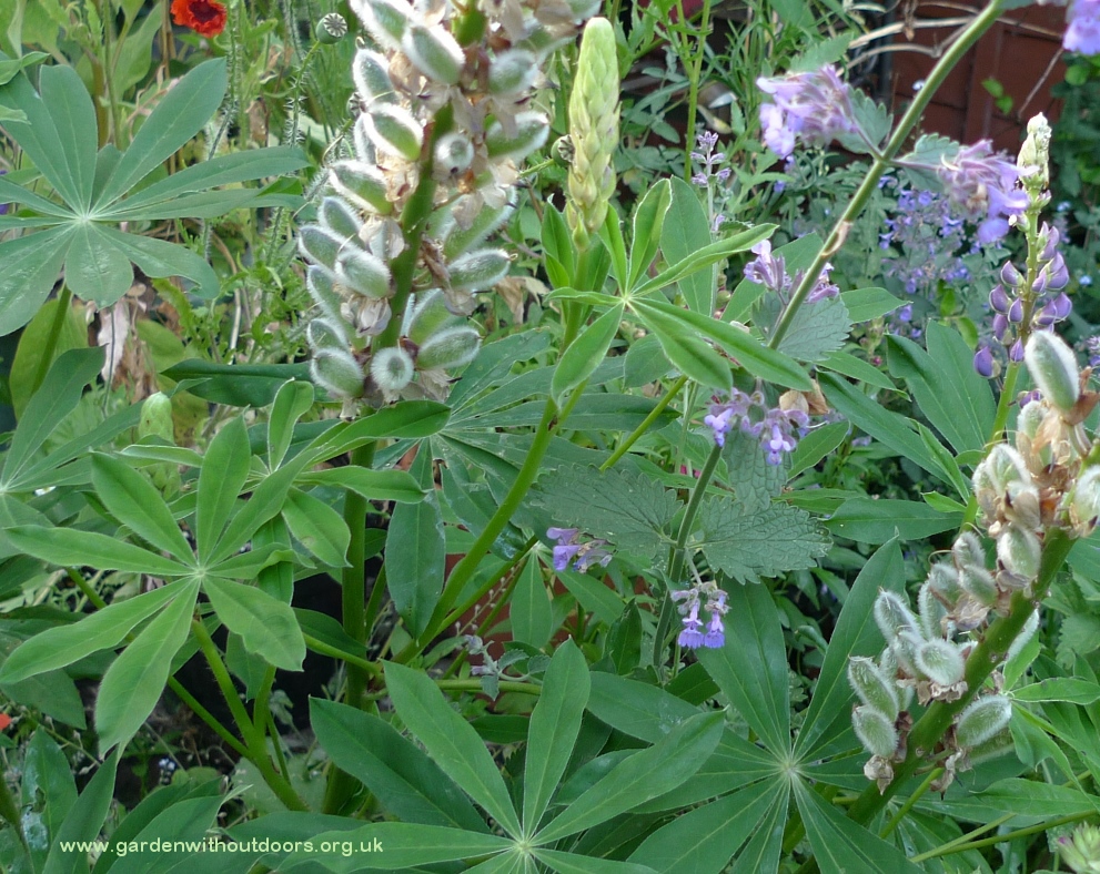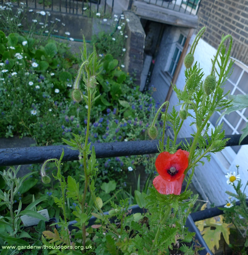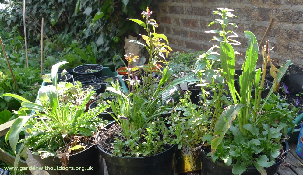 also in the front garden, lesser knapweed, first iris foetidissima flowers in the background to the right