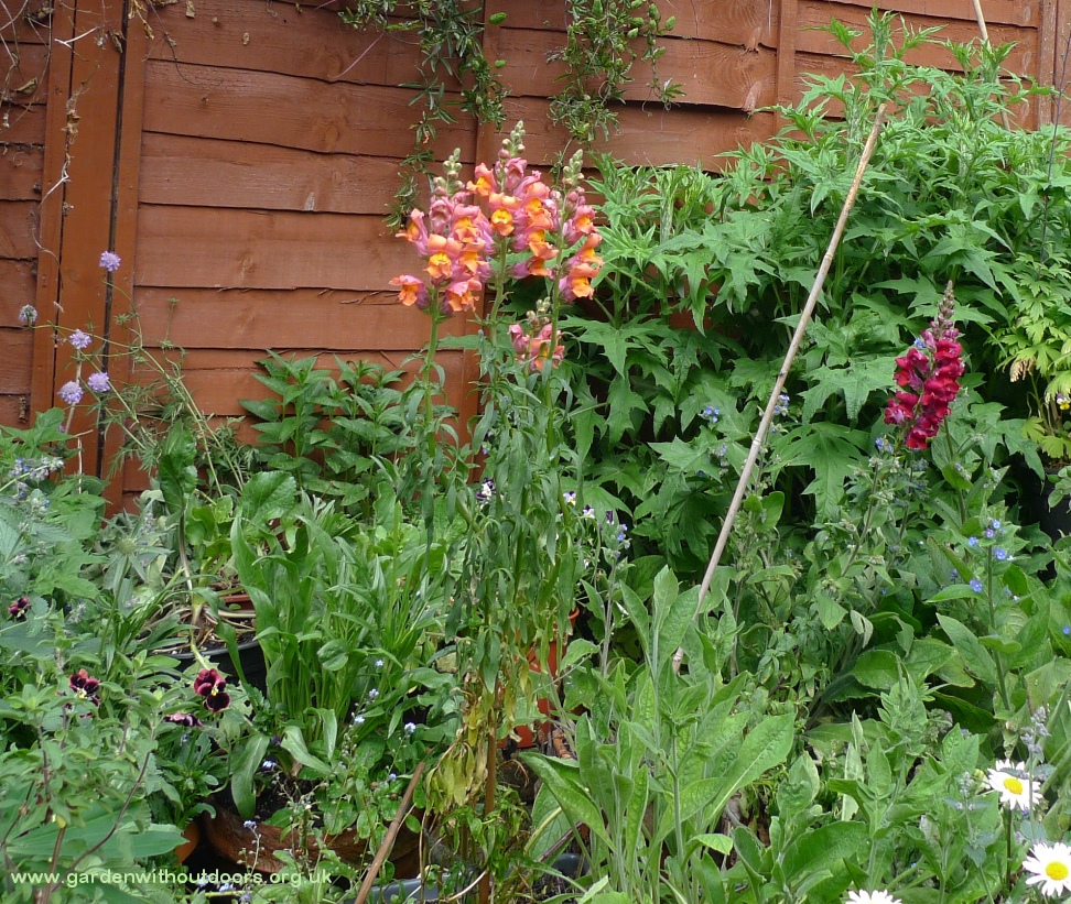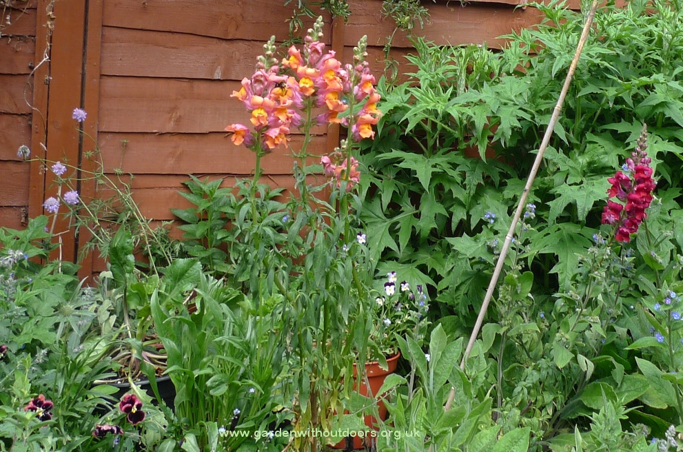 there is a bee on the peachy snapdragons on the left, although admittedly a bit small to see, all of the snapdragons here self-seeded as did the violas