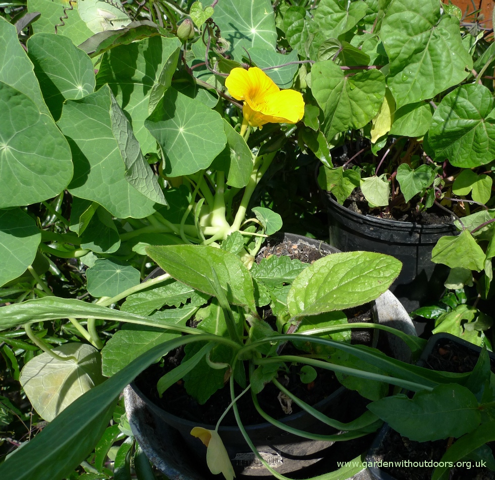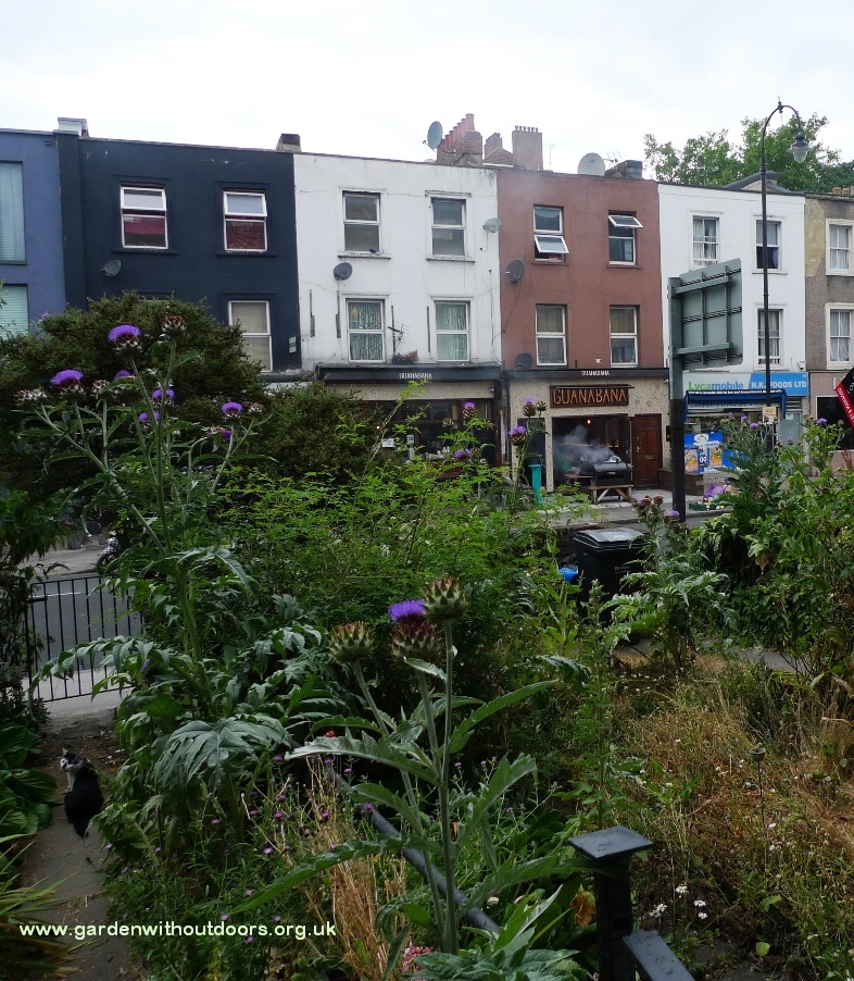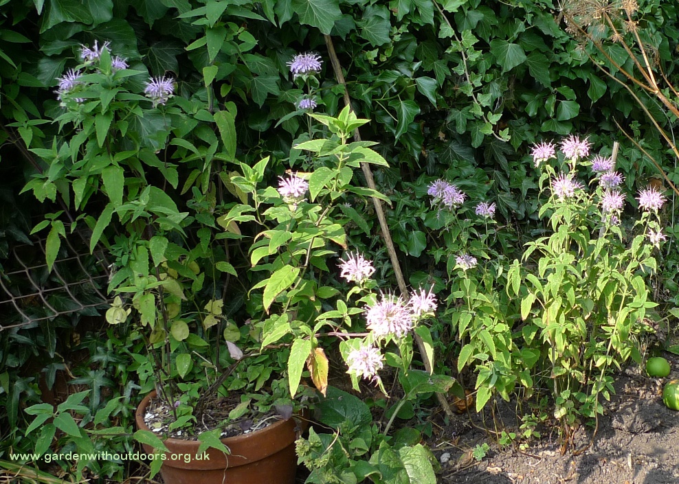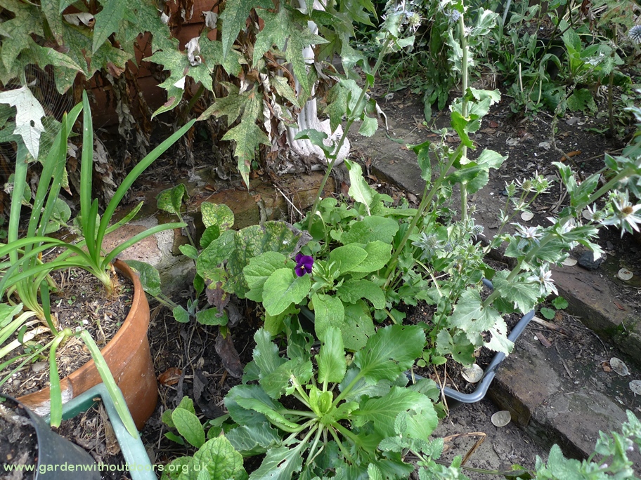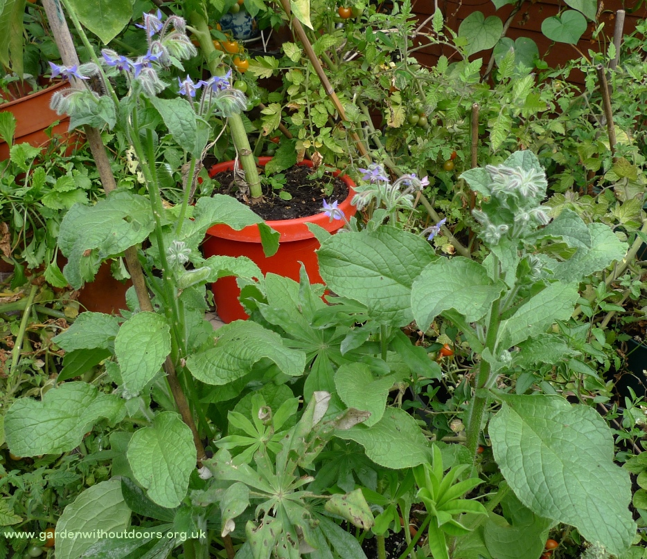 the daisies and forget-me-not are finished in the compost pile garden, now teasel, morning glory and the blackberry hanging basket (I have no place to hang it)