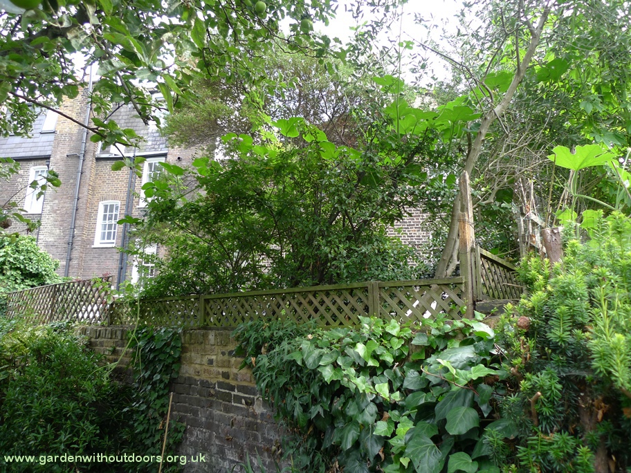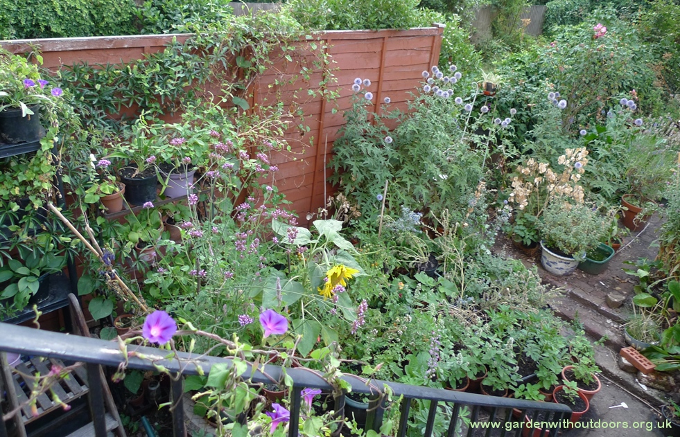 View from my stairs down to the garden, flowers: cornflowers, delphiniums, verbena bonariensis, foxglove, knautia, scabious, corn cockle, tomatoes, poppies, honeysuckle, nepeta; buds: globe thistle; still awaiting buds: lupin and monarda.