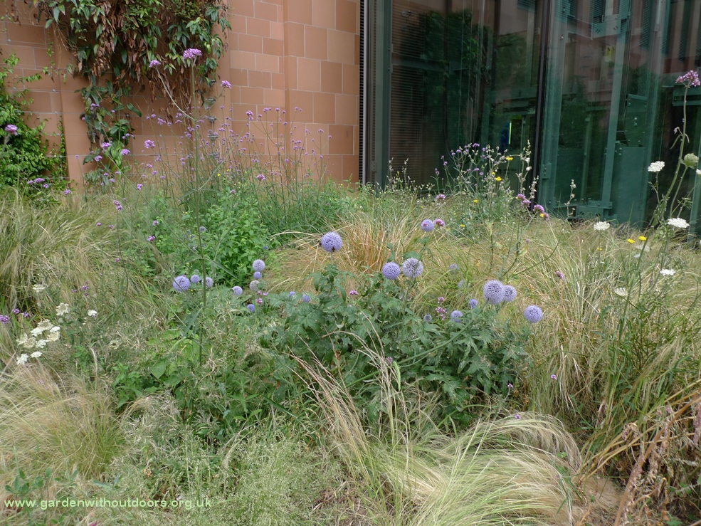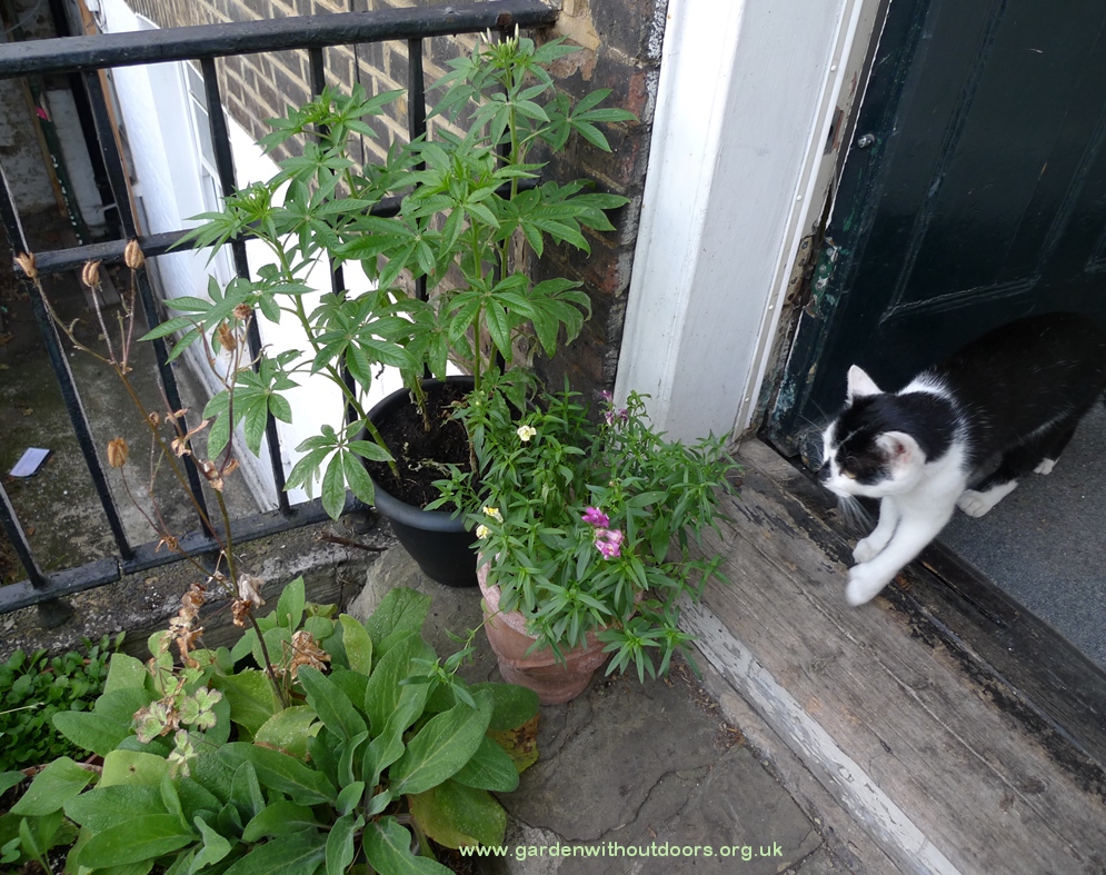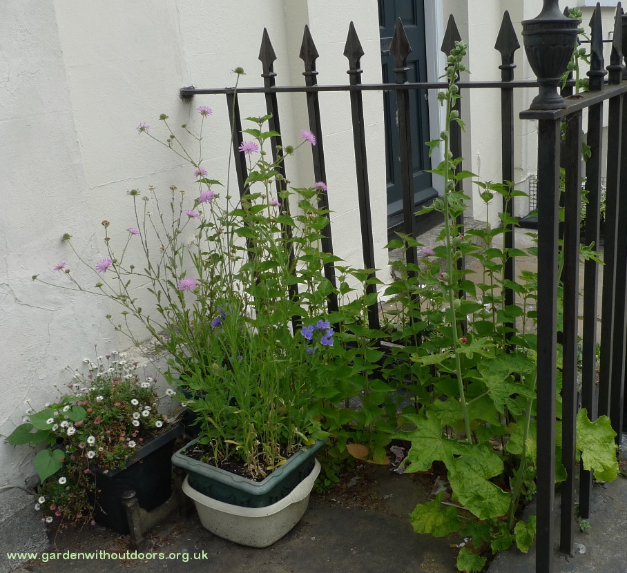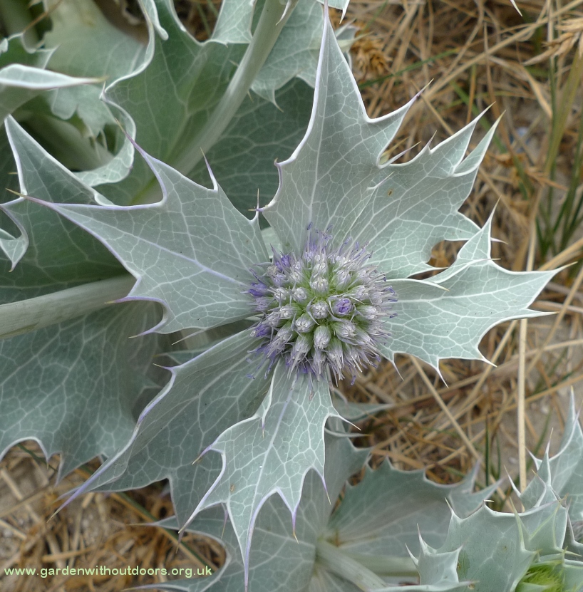 I am so happy to have sea holly - that I haven't spent a lot on in the garden centre. Slugs have eaten those from last year as soon as they started coming up this year - but I collected and planted seeds from them last year and now this year, they are blooming. Not as exuberant as those from the garden centre last year but they're getting established, have the challenge of growing in pots and coping with drought (which they'd be able to cope with after getting established). The stems are starting to turn purple, in that fantastic electric way they have of doing so.