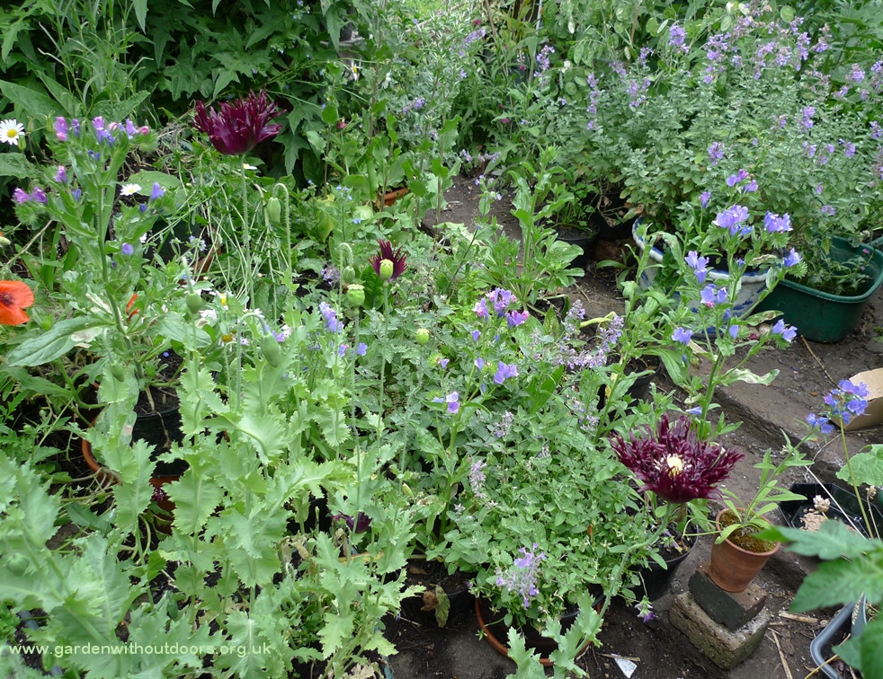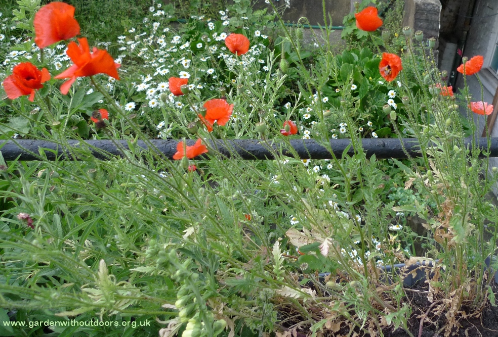 I am still surprised when I get flowers from seeds I planted. I shouldn't be but it's so often hit and miss. Black Swan poppies and echium Blue Bedder. The poppies only last a short time so in just the last few days I have 3 seed heads without petals. The terracotta pot on the right on the bricks has an echium vulgare which I put next to the echium Blue Bedder to compare the flowers, difference in size but otherwise extremely similar.