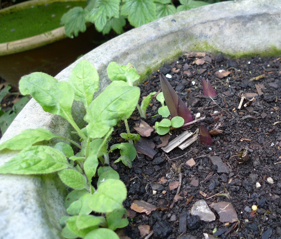 a tiny, tiny chinese lantern sprout which I didn't notice until I stepped on while pruning, still growing - I think - will try to look out for them better
