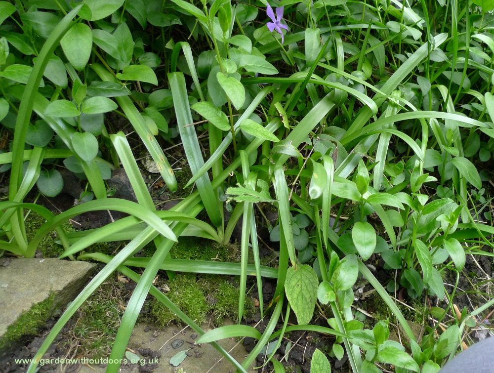 I am going to try to dig up a few more bluebells if I can but if I can't I'll just cut off the leaves and prevent them from blooming. Eventually the bulbs will weaken and die. I'm sure they're all hybrids of native and foreign bluebells (and were in the garden when I moved in), see also  Bluebells. and bluebells in the Weed guide.