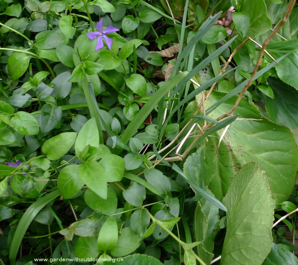 Below, in front of the vinca are bluebells, thinner leaves than the hyacinths and not upright but sloping over and with a ridge down the back of the leaves.