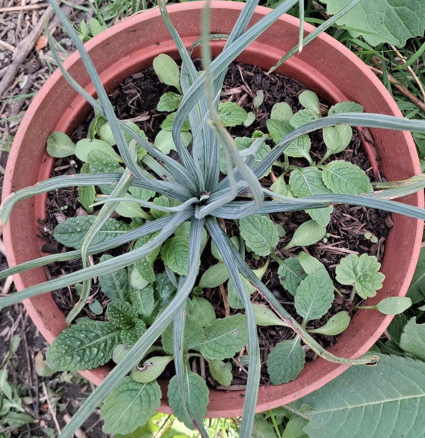 I had so many Iris foetidssima in my last garden and so many self-seeding I was surprsed I didn't have any seedlings appearing in the pots in my new garden. I finally had 1 but it appeared to die. Then I noticed this largish one in this pot with a large green alkanet. I wonder if it is foetidissima but definitely looks like an Iris. Will see what happens. When the ground is softer I am going to try to plant this pot in the ground.